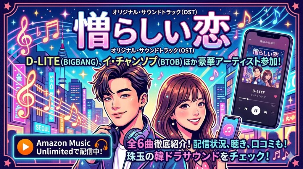 韓国ドラマ「憎らしい恋」のOST(サウンドトラック)は、D-LITE(BIGBANG)やイ・チャンソプ(BTOB)など豪華アーティスト6組が参加した珠玉の全6曲で構成されています。この記事では、各曲の情報や配信状況、聴きどころ、視聴者の口コミ・評判までまとめ... -