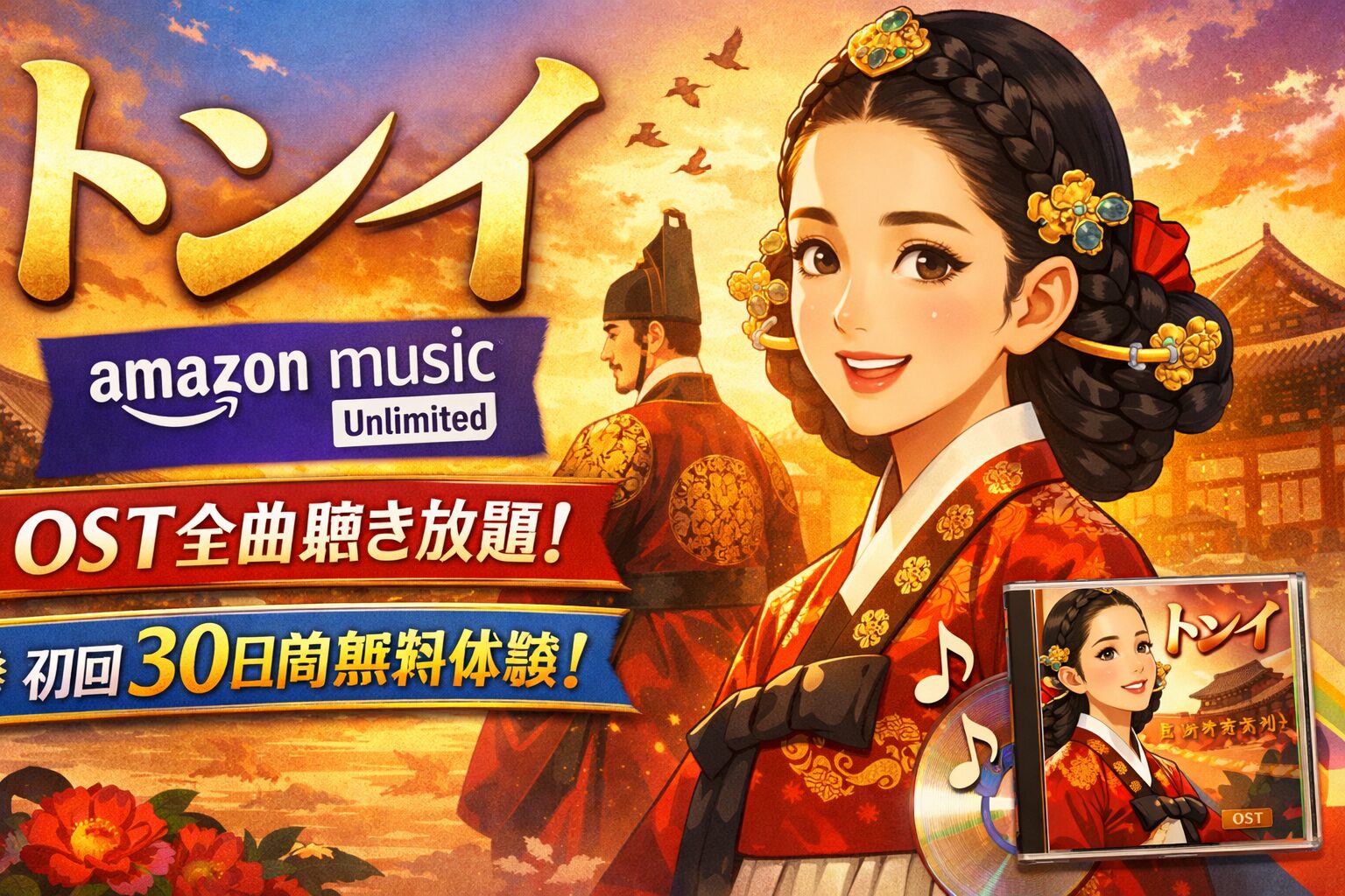 トンイのサウンドトラック全18曲は、Amazon Music Unlimitedで配信されています。主題歌「チョネジア」はもちろん、劇中を彩るインストゥルメンタル楽曲や歌唱曲まで、すべてサブスクリプションで聴き放題です。初回30日間の無料体験を利用すれば、費用をかけずにトンイの世界観を存分に味わえます。