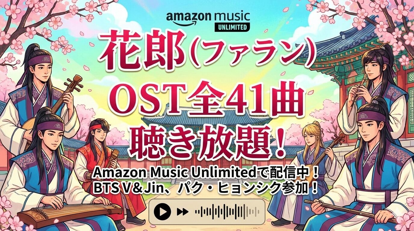 韓国ドラマ「花郎(ファラン)」のOSTは、Amazon Music Unlimitedで配信されており、ヴォーカル全11曲とインスト30曲の計41曲をすべて聴き放題で楽しめます。BTSのV&Jinが歌う「死んでも君だよ」やパク・ヒョンシクの「ここにいるよ」など、豪華キャスト陣の歌声を今すぐスマホひとつで堪能できます。