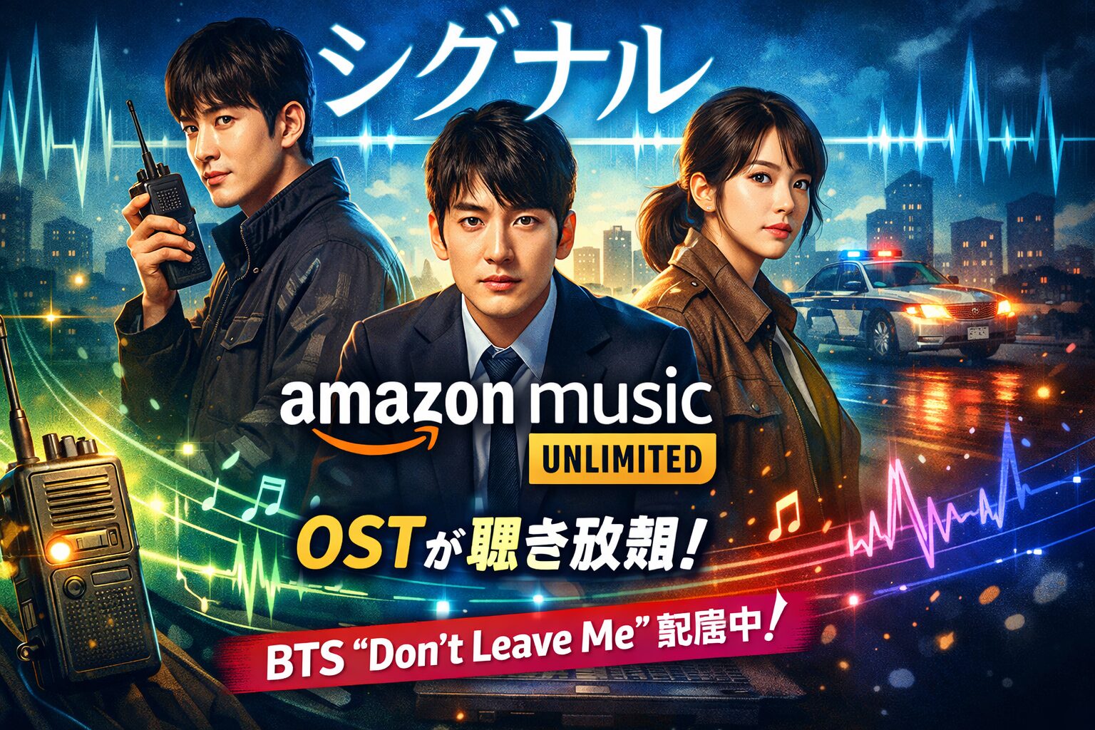 韓国ドラマ「シグナル」のOSTは、Amazon Music Unlimitedで主要楽曲が配信されています。チャン・ボムジュンの「回想」やキム・ユナの「道」をはじめとするボーカル曲、そしてインストゥルメンタルトラックも含め、ドラマの世界観を彩った楽曲をフル尺で楽しむことができます。また、日本版リメイクの主題歌であるBTSの「Don’t Leave Me」もAmazon Music Unlimitedの配信対象です。月額1,080円(税込)で「シグナル」OSTはもちろん、韓国ドラマの膨大なOSTコレクションが聴き放題になります。